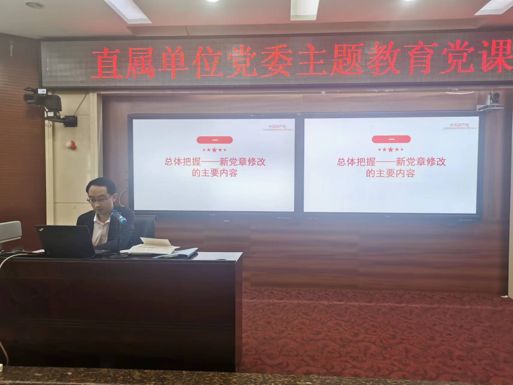 首先党委书记刘仁馨以《学党章、悟思想、强党性,做一名合格党员》为题,对全体党员讲授一堂党课。刘仁馨从《党章》出发,要求广大党员立好“政治标尺”固根守魂,在工作学习中加强党性锻炼,淬炼“忠诚底色”。在主题教育中,学思想必须见行动,对标校党代会提出的学校未来五年改革发展的“1221”战略部署,各支部要立足实际工作,增强“两个功能”发挥“两个作用”,解决支部、部门实质问题,并要求直属单位党委广大党员干部既要饱蘸“实干”浓墨,更要继续写好主题教育“建新功”的文章。